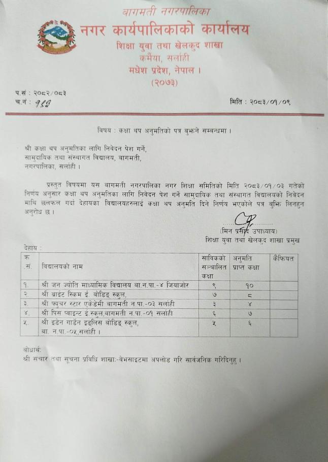 कक्षा थप अनुमतिको पत्र बुझ्ने सम्बन्धमा