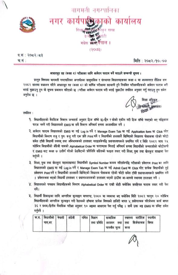 आधारभूत तह (कक्षा ८) परीक्षाका लागि आवेदन फारम भर्ने भराउने सम्बन्धी सूचना ।
