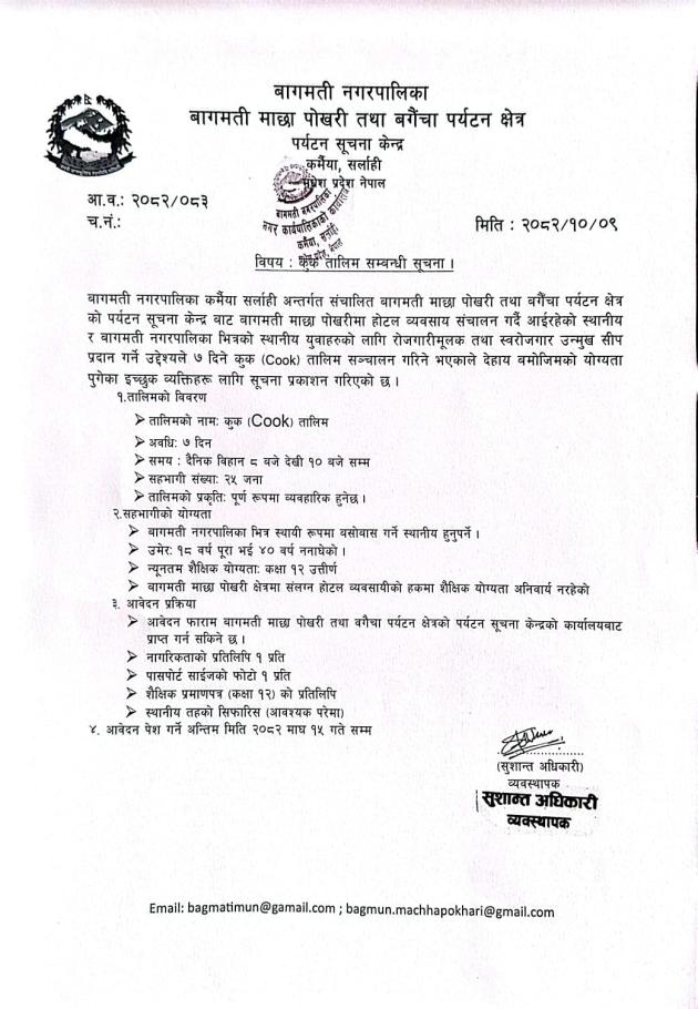 कुक तालिम सम्बन्धी सूचना